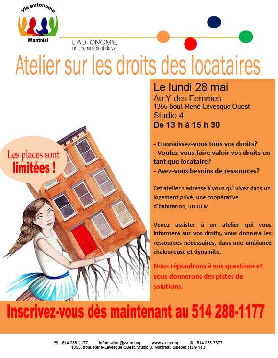 Autres évènements Défense des droits Intégration sociale Invitation à un atelier sur les droits des locataires mardi 15 mai 2012mercredi 16 mai 2012 Sara Leblanc 0 Comment Voici une invitation à un atelier de Vie autonome-Montréal :