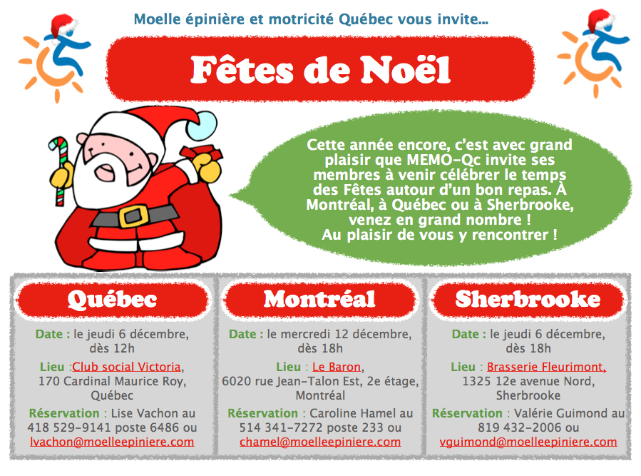 À Québec, à Montréal ou à Sherbrooke, c’est un rendez-vous! Vous pourrez célébrer avec nos le début du temps des fêtes autour d’un bon repas. Des surprises, de l’animation, des lieux accessibles, nous avons pensé à tout pour vous faire plaisir. Joignez-vous à nous!