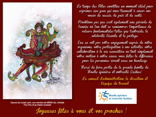 Toute l’équipe de MÉMO-Qc vous souhaite de très joyeuses fêtes et profite également de l’occasion pour vous inviter à visionner un extrait de l’émission C’est ça la vie du 14 décembre dernier, tourné lors de notre dîner de Noël à Québec, dans lequel vous pourrez entendre de touchants témoignages de personnes blessées médullaires qui à notre avis saisissent l’essence de ce que nous faisons et de l’importance de se réunir et d’échanger durant la période des Fêtes.