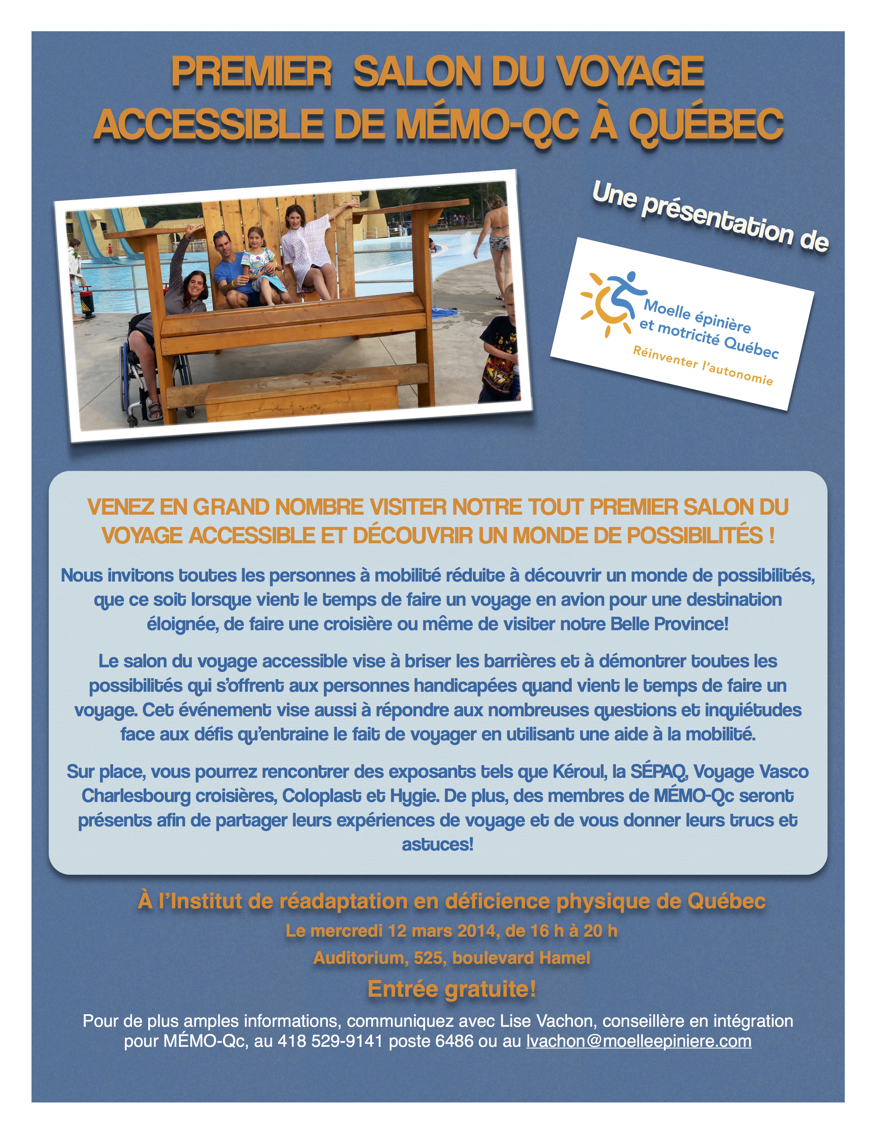 Intégration sociale Nos évènements/activités Un premier salon du voyage accessible à Québec pour MÉMO-Qc mercredi 29 janvier 2014mardi 4 mars 2014 salon du voyage accessible Consultez l’affiche suivante pour tous les détails!