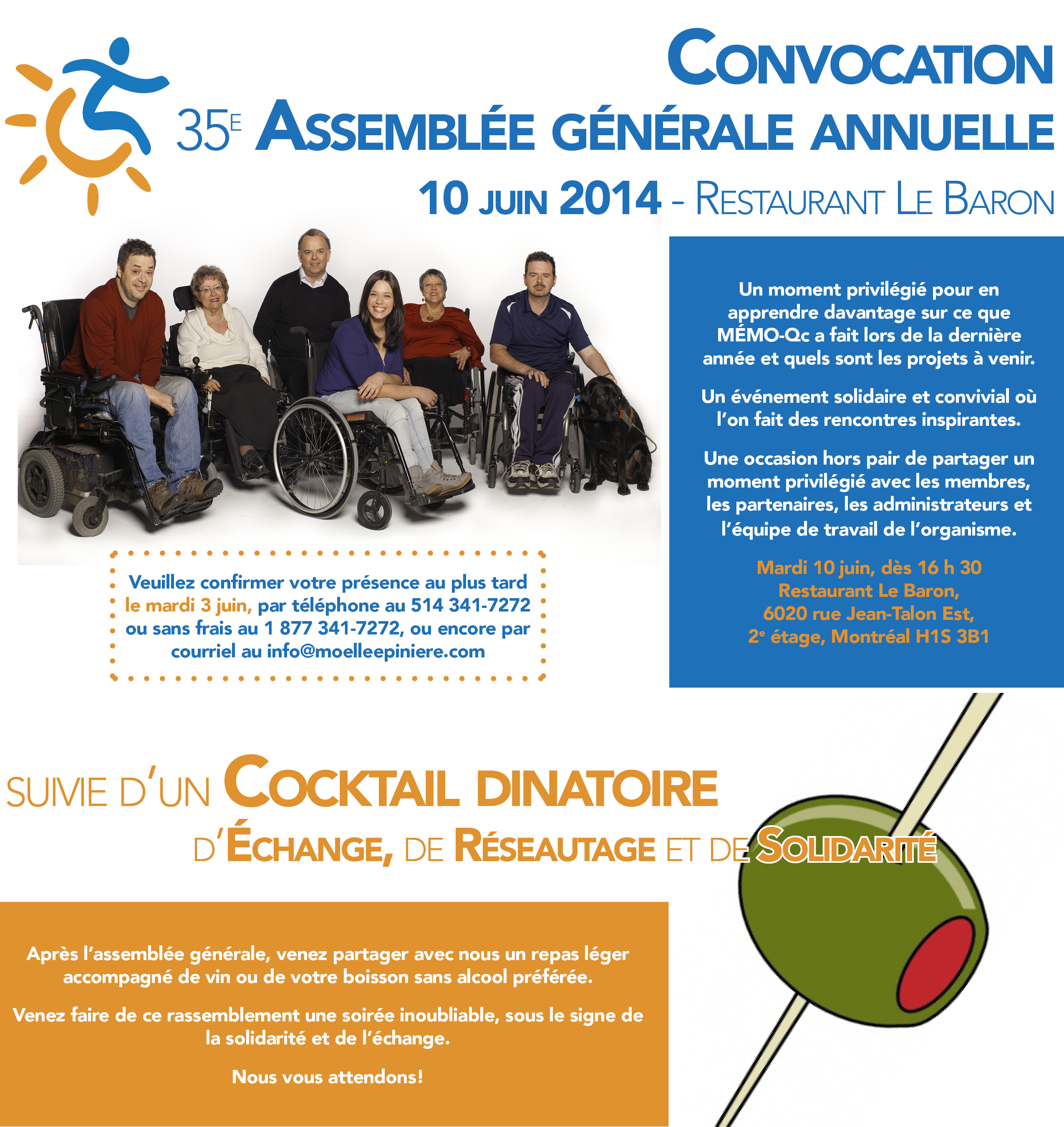 Moelle épinière et motricité Québec a le grand plaisir de vous inviter à son assemblée générale annuelle, qui aura lieu le mardi 10 juin 2014 dès 16 h 30, au Restaurant Le Baron, 6020, rue Jean-Talon Est, 2e étage, Montréal (Québec) H1S 3B1.