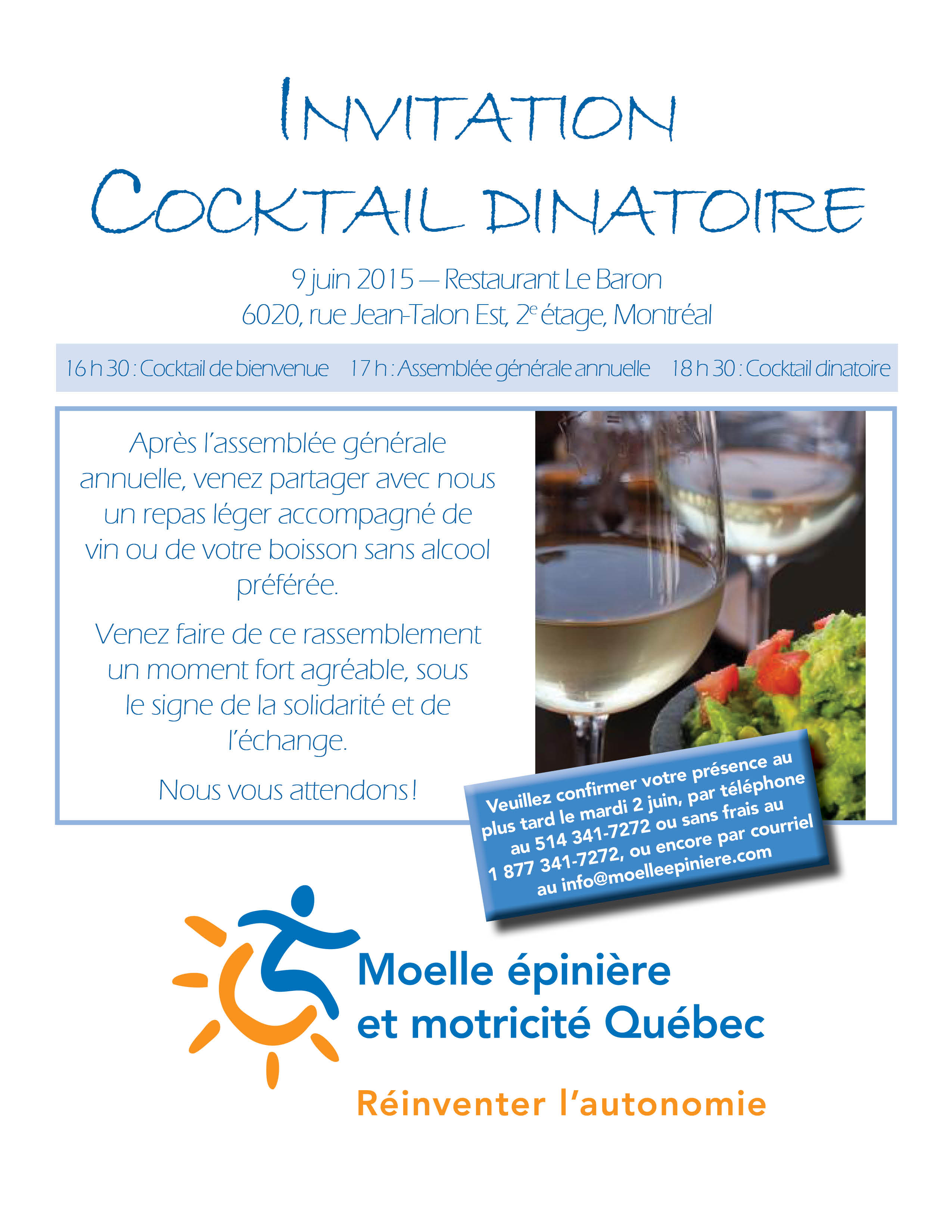 Le 9 juin prochain se déroulera l’assemblée générale annuelle de Moelle épinière et motricité Québec. Vous êtes invité(e)s à vous joindre à nous pour l’assemblée et à rester pour un cocktail dînatoire par la suite. N’oubliez pas de confirmer votre présence au plus tard le mardi 2 juin.