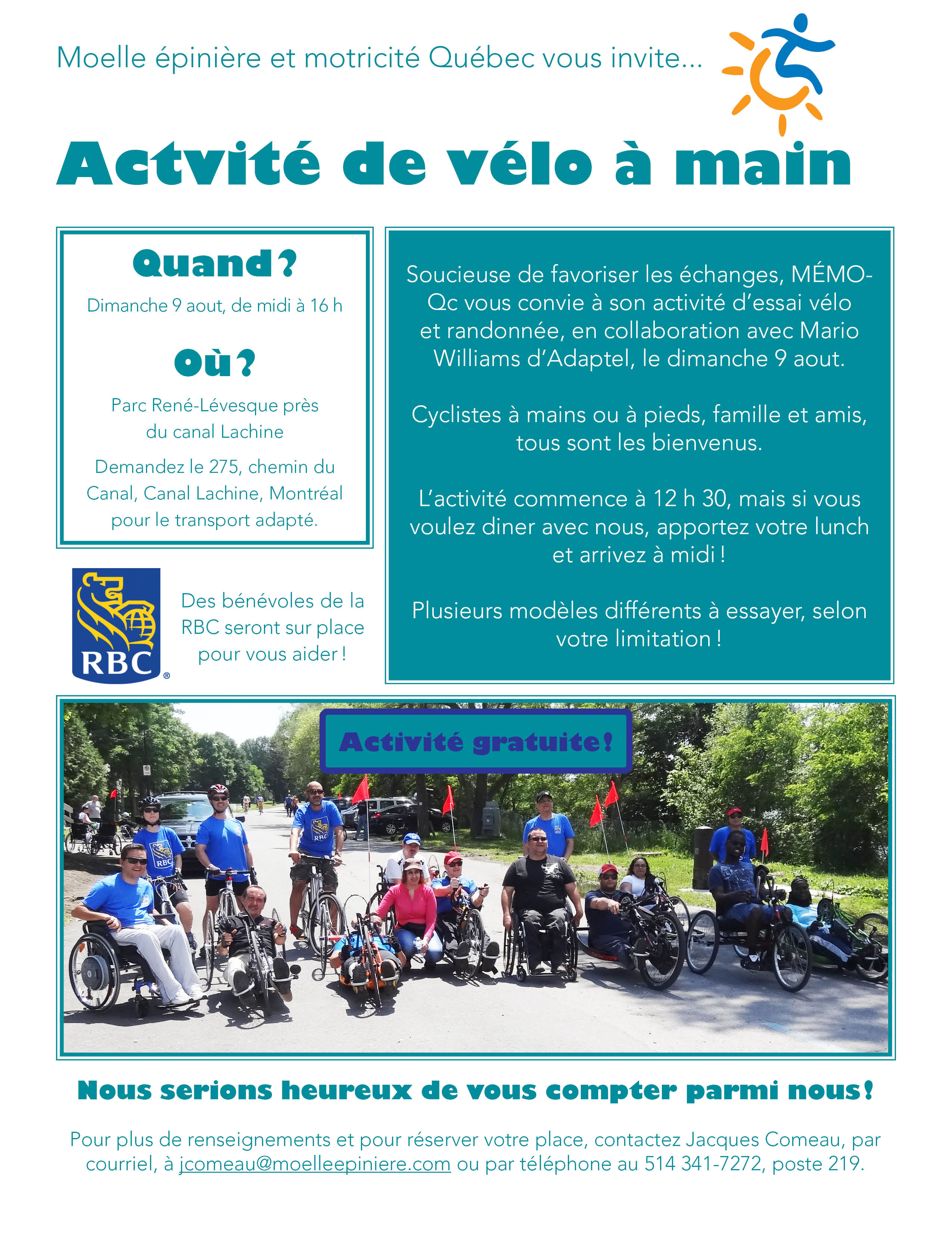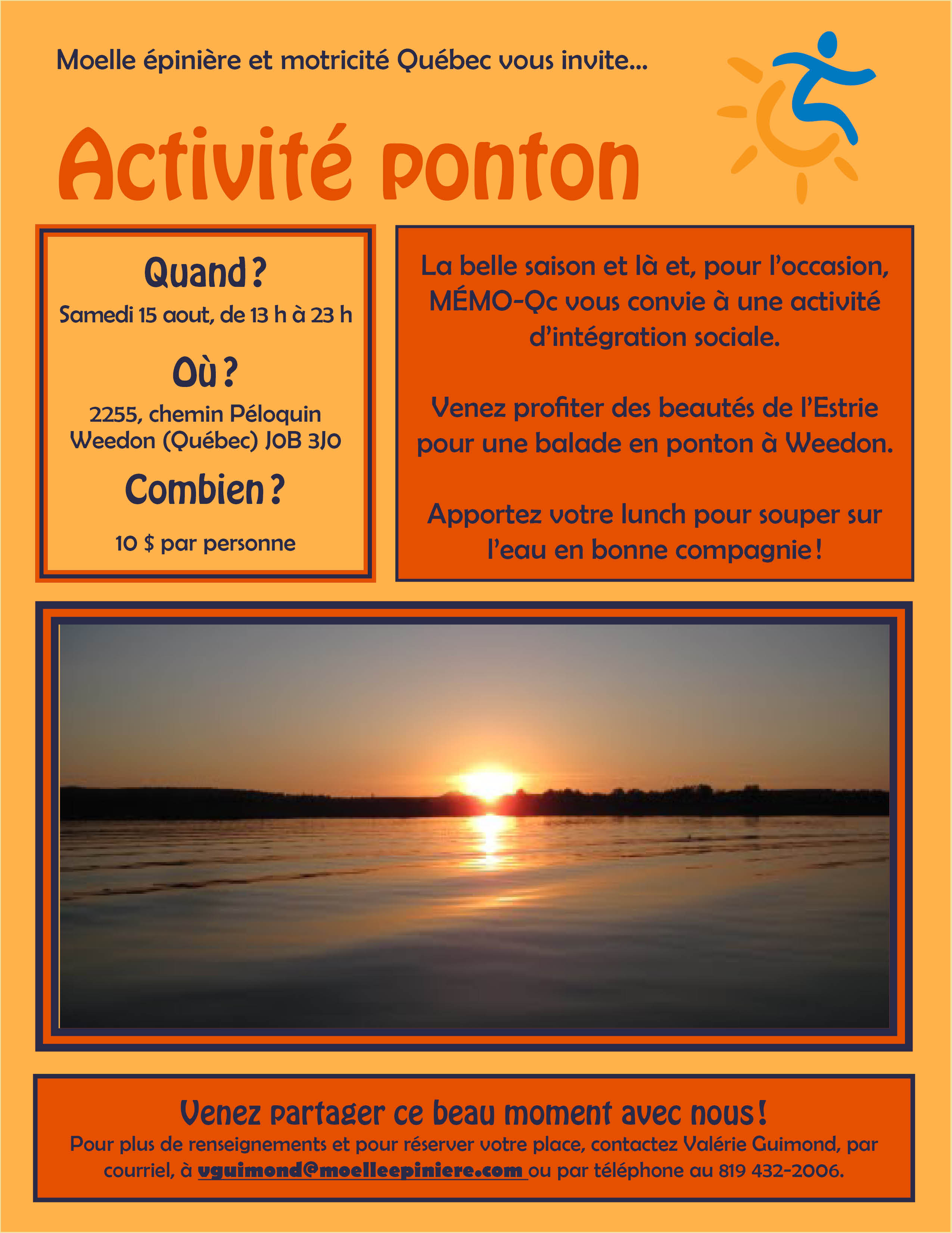 Actualités de MEMO-Qc Nos évènements/activités Un été plein d’activités chez MÉMO-Qc mardi 14 juillet 2015dimanche 25 février 2024 Amélie Tremblay activités, bbq, MÉMO-Qc, ponton, souper, vélo à main Moelle épinière et motricité Québec vous propose de nombreuses activités dans différentes régions du Québec. Joignez-vous à nous pour profiter de l’année en bonne compagnie.
