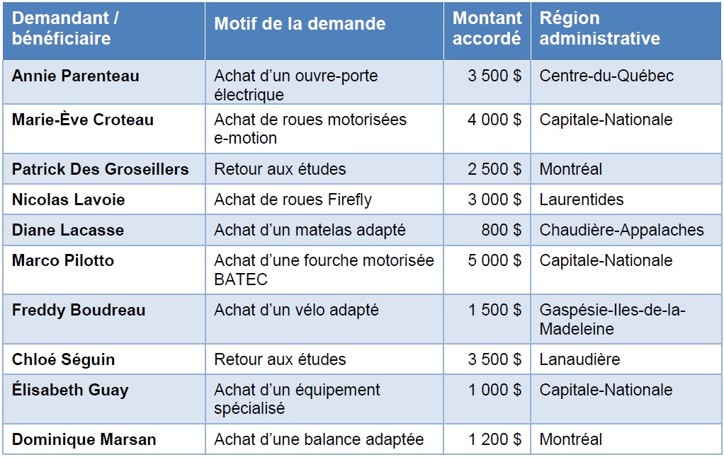 Cette année, 25 demandes en tout ont été reçues dans le cadre de ce programme. Elles ont été évaluées par un comité de sélection formé de Josée Dubois, ergothérapeute à l’Institut de réadaptation Gingras-Lindsay de Montréal (IRGLM), Maxime Girard, président de la Fondation 33, Marie-Blanche Rémillard, présidente du conseil administratif de MÉMO-Qc, Marie Riley-Nobert. ergothérapeute à IRGLM et Walter Zelaya, directeur général de la Fondation MÉMO-Qc.