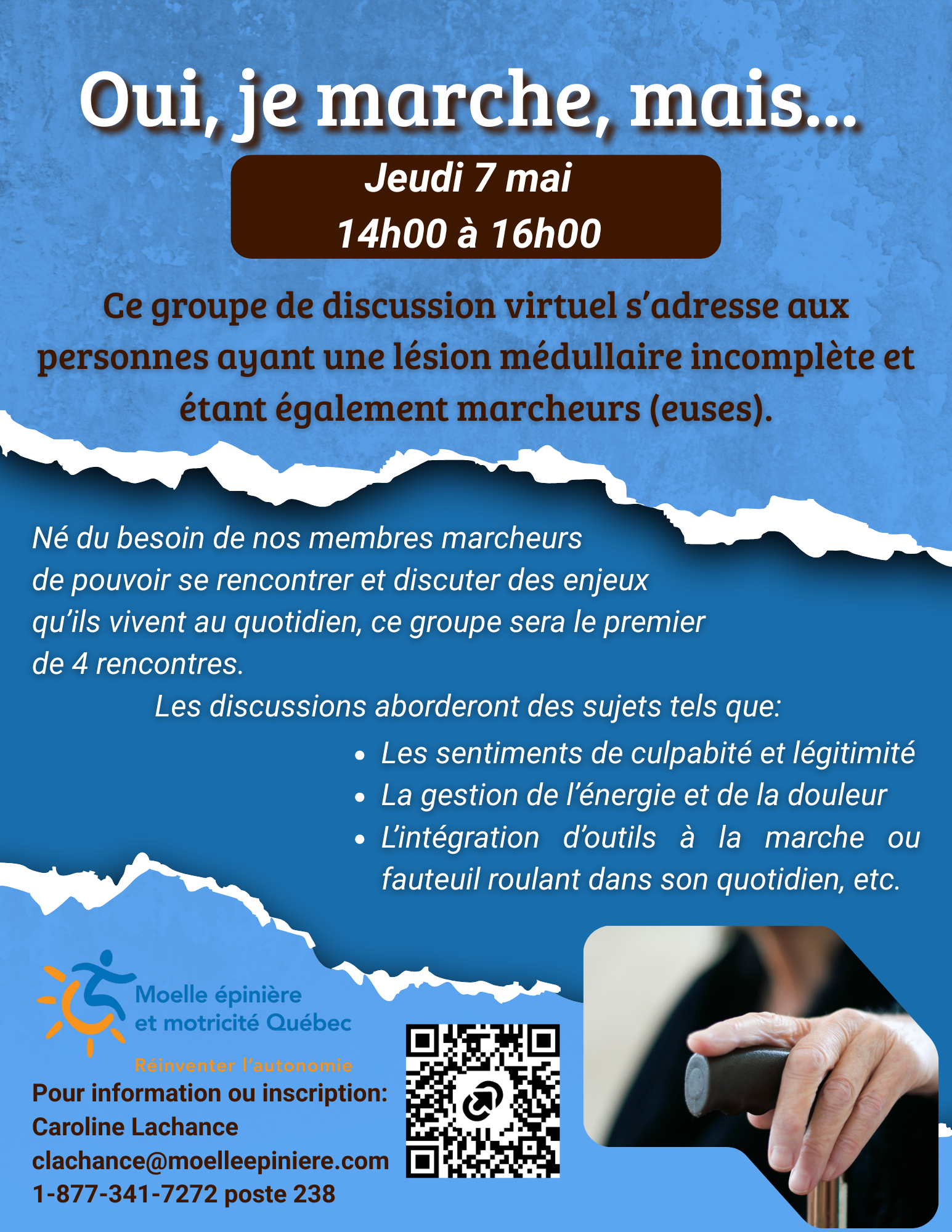 Groupe de discussion virtuel pour les personnes qui ont une lésion médullaire incomplète et qui ont conservé la capacité de marcher Détails de l'événement Date: 7 mai, 2026 2:00 pm – 4:00 pm